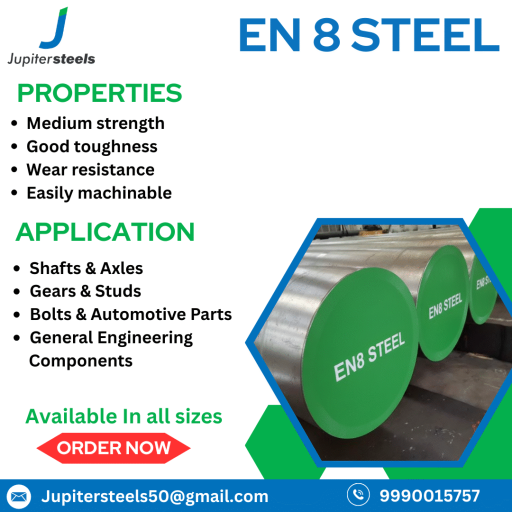 EN 8 steel is a widely used medium carbon steel in the general engineering sector. Known for its good tensile strength, machinability, and weldability, it is a versatile and cost-effective choice for a wide range of components. It is typically supplied in an as-rolled condition, but its properties can be significantly enhanced through heat treatment. At Jupiter Steels, based in Delhi, we are a trusted stockist and supplier of EN 8 steel, providing certified material to customers throughout India, including key industrial regions like Manesar, Haryana, and beyond.
